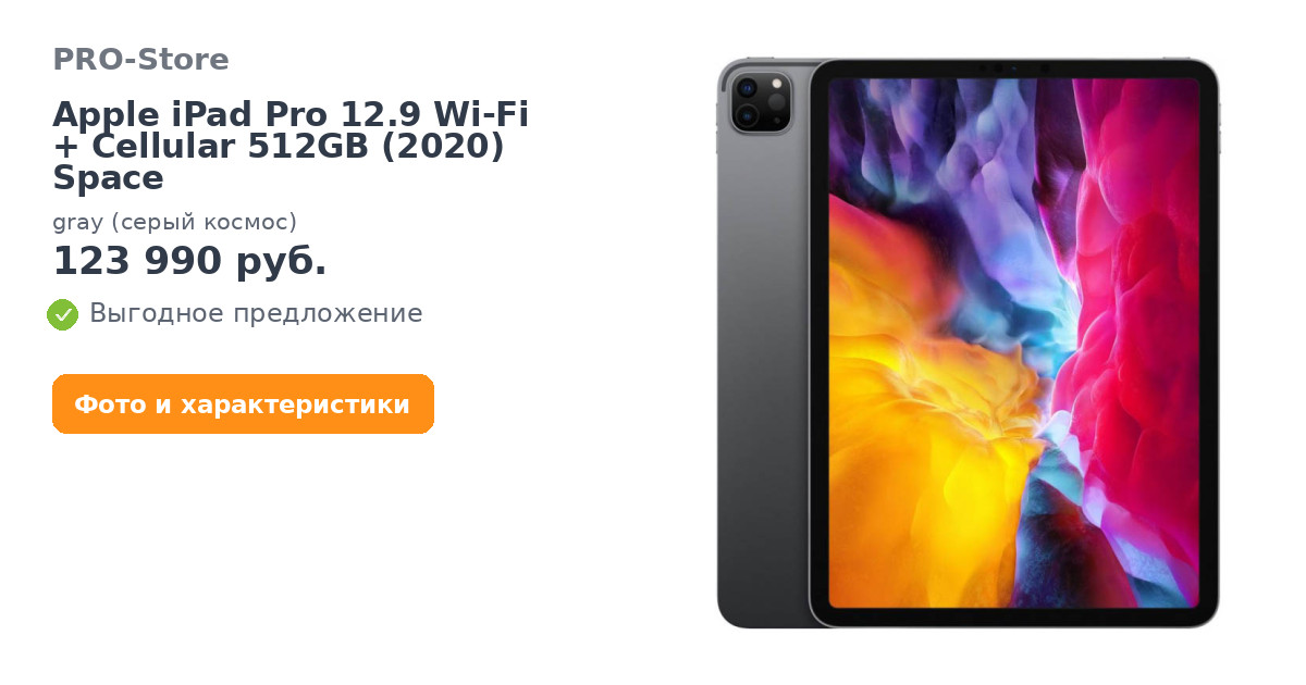 iPad Pro 12,9 дюйма оснащен потрясающим дисплеем Liquid Retina от края до края.1 Его новые камеры уровня Pro — широкоугольная и сверхширокоугольная — и сканер LiDAR открывают невероятные возможности для передовых приложений с дополненной реальностью. Мощный процессор A12Z Bionic обеспечивает работу всех необходимых приложений и игр со сложной графикой. Поддерживаются Apple Pencil2 и новая клавиатура Magic Keyboard с трекпадом.2 Доступна быстрая связь по Wi‑Fi и 4G LTE.3 Можно работать весь день без подзарядки.4 А наличие миллионов приложений в App Store позволяет использовать iPad Pro для самых разных задач, где бы вы ни были.