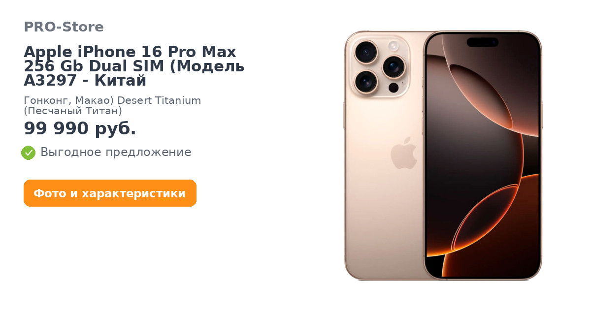 Apple iPhone 16 Pro Max 256 Gb Dual SIM (Модель A3297 - Китай, Гонконг, Макао) Desert Titanium (Песчаный Титан)
