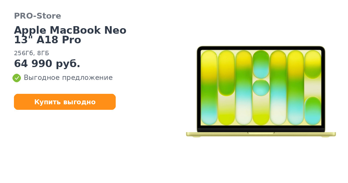 Apple MacBook Neo 13" A18 Pro, 256Гб, 8ГБ, 6C CPU, 5C GPU, MHFD4, Желтый цитрус/Citrus