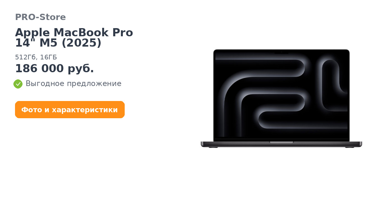 Идеален для работы, развлечений и творчестваТакой же, как прежде, но это – только внешность. С процессором M5 14- дюймовый MacBook Pro одинаково удобен для профессионального использования и повседневных дел. Этот процессор может соперничать с чипами Pro-серии предыдущего поколения, демонстрируя внушительную энергоэффективность. Ну а возможности macOS, поддержка сервисов Apple и встроенные средства защиты данных, в сочетании с безупречным дизайном, делают выбор очевидным.