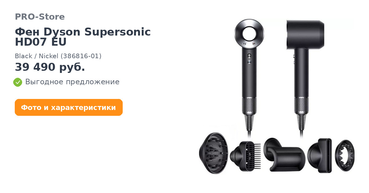 Фен Dyson Supersonic™ разработан для защиты волос от экстремального теплового повреждения. Он обеспечивает быструю сушку и контролируемую укладку, чтобы сделать волосы более гладкими на 75 %, усилить блеск на 132 % и уменьшить пушистость и пушистость на 61 %.