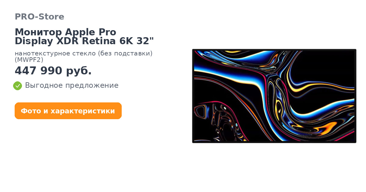 Первый в мире монитор Retina 6K с диагональю 32 дюйма. Яркость до 1600 кд/м². Поразительная контрастность 1 000 000:1 и сверхширокий угол обзора. Более миллиарда цветов, переданных с исключительной точностью. И динамический диапазон, который полностью меняет представления о профессиональном рабочем процессе. Представляем Apple Pro Display XDR — идеальный монитор для профессионалов.