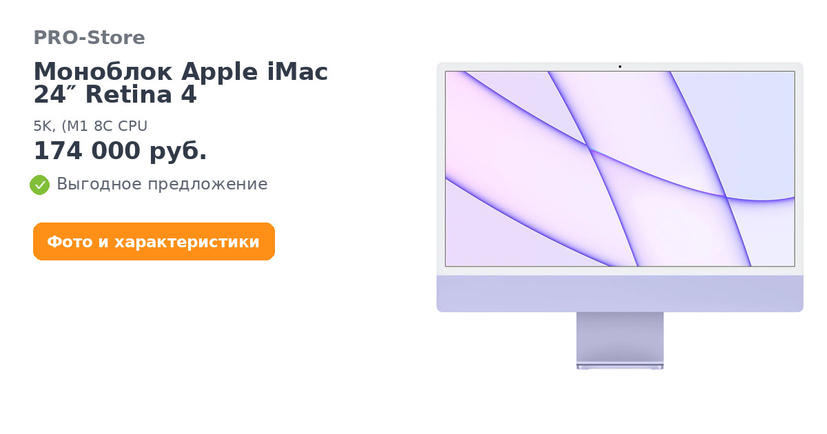 Моноблок Apple iMac 24″ Retina 4,5K, (M1 8C CPU, 8C GPU), 8 ГБ, 256 ГБ SSD, Фиолетовый (Z130002B8)