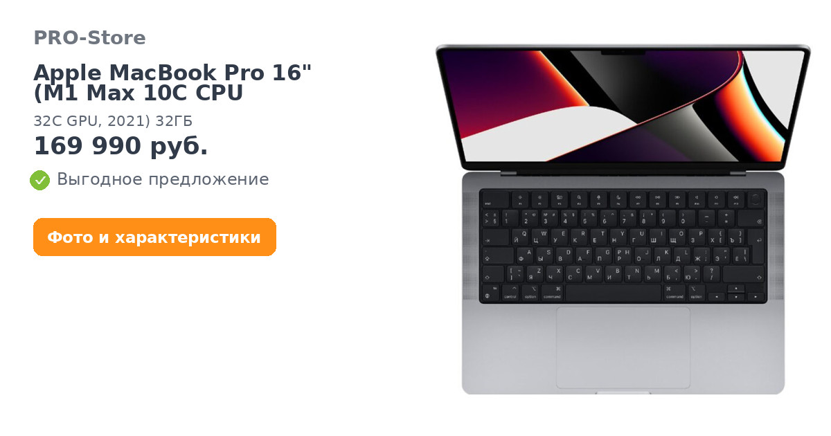 Супербыстрые чипы M1 Pro и M1 Max дают феноменальную производительность и обеспечивают удивительно долгое время работы без подзарядки. Прибавьте к этому потрясающий дисплей Liquid Retina XDR и ещё больше портов для профессиональной работы. Это тот самый ноутбук, который вы так ждали.