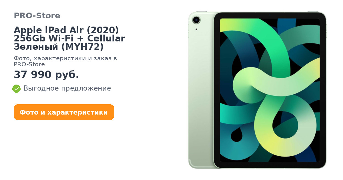 - Комплектация: iPad Air 10,9 дюйма, Зарядный кабель USB‑C, Адаптер питания USB‑C мощностью 20 Вт