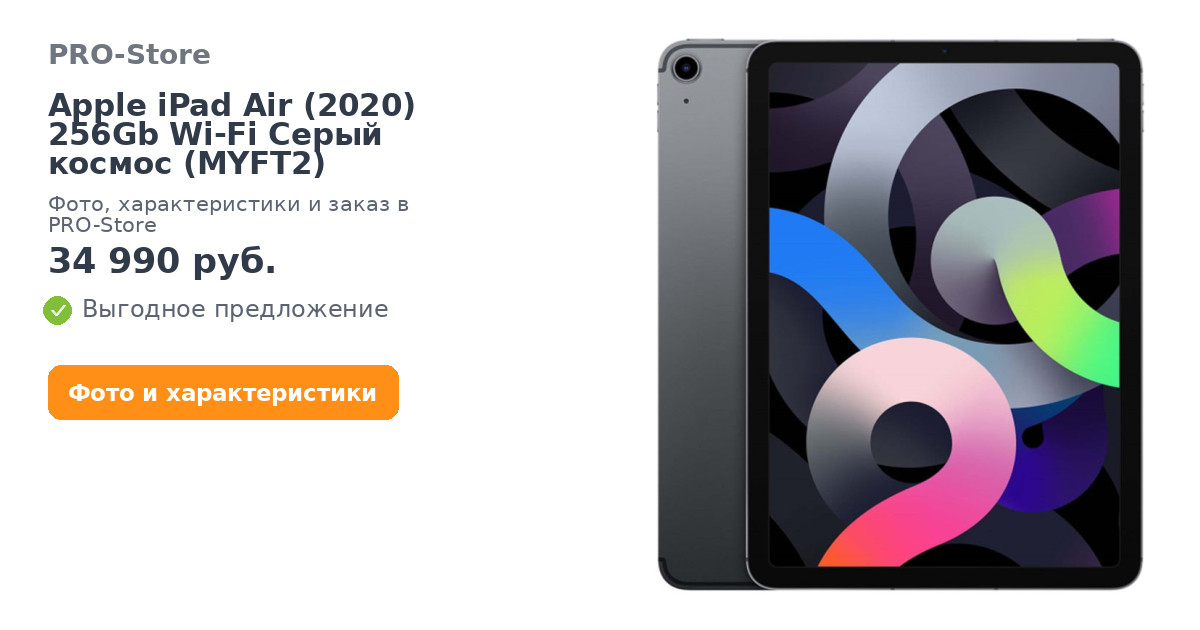 - Комплектация: iPad Air 10,9 дюйма, Зарядный кабель USB‑C, Адаптер питания USB‑C мощностью 20 Вт