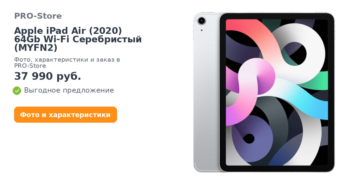 - Комплектация: iPad Air 10,9 дюйма, Зарядный кабель USB‑C, Адаптер питания USB‑C мощностью 20 Вт