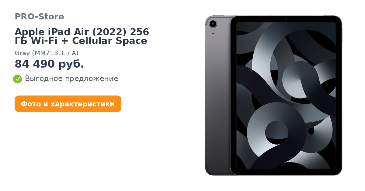 - Комплектация: iPad Air 10,9 дюйма, Зарядный кабель USB‑C, Адаптер питания USB‑C мощностью 20 Вт