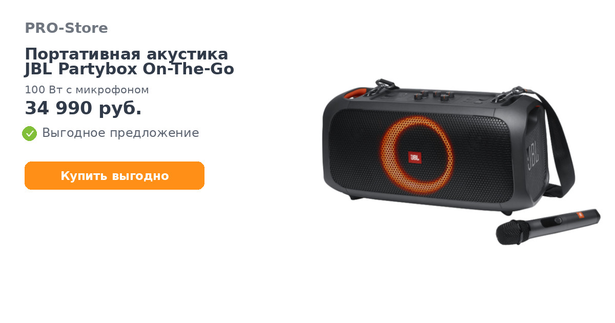 JBL PartyBox On-The-Go — отличный вариант для тех, кто хочет раскачать вечеринку будь то дома или на пикнике. Давайте ещё раз отметим основные преимущества колонки. Во-первых, это по-настоящему мощный и громкий звук с хорошими басами, которые можно добавить отдельно. Во-вторых, работа от аккумулятора, заряда которого хватает на три часа при использовании колонки на полную: с максимальной громкостью, подключённым микрофоном и гитарой. В более спокойном режиме она проработает до шести часов. В-третьих, возможность подключать самые разные устройства по Bluetooth или слушать музыку с флешки. В-четвёртых, разноцветная подсветка для создания динамического шоу. Наконец, беспроводной микрофон в комплекте для любителей караоке и защита от брызг для поклонников отдыха на природе.