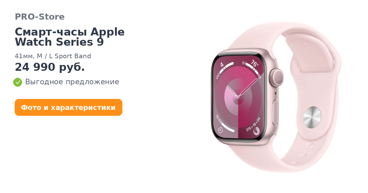 Смарт-часы Apple Watch Series 9, 41мм, M/L Sport Band, Нежно-розовый (MR943)