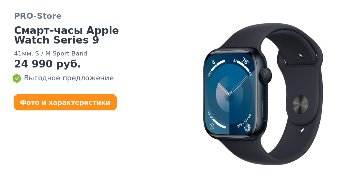 Смарт-часы Apple Watch Series 9, 41мм, S/M Sport Band, тёмная ночь (MR8W3)