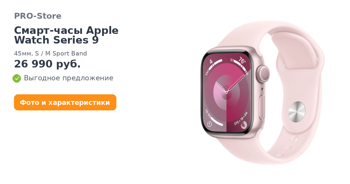 Смарт-часы Apple Watch Series 9, 45мм, S/M Sport Band, Нежно-розовый (MR9G3)