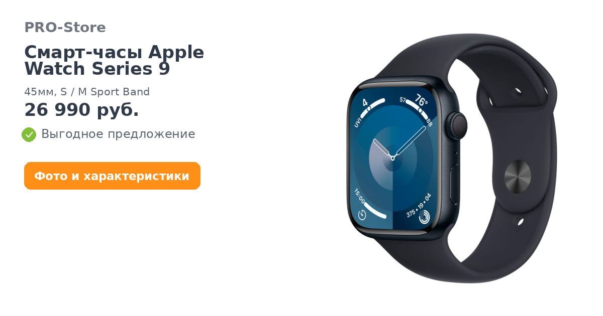 Смарт-часы Apple Watch Series 9, 45мм, S/M Sport Band, тёмная ночь (MR993)