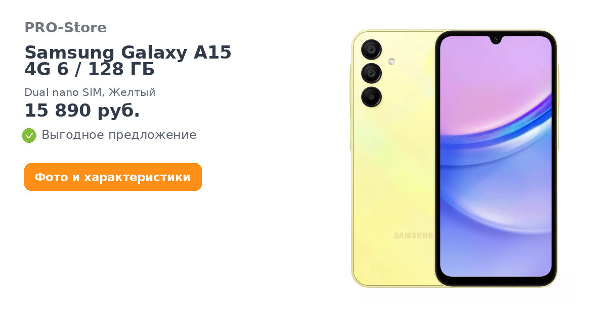 Смартфон Samsung Galaxy A15 4G 6/128 ГБ, Dual nano SIM, Желтый
