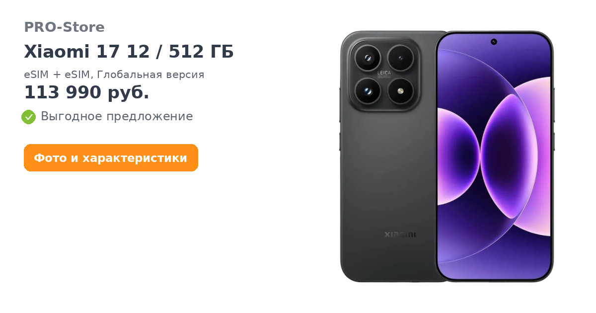 В Xiaomi 17 установлена тройная система камер с Leica-оптикой: основная 50 МП (экв. 23 мм) с диафрагмой ƒ/1.67, OIS и сенсором Light Fusion 950 (размер 1/1.31", динамический диапазон 13.5EV, «суперпиксель» 2.4 μm 4-in-1). Дополняют её 50 МП ультраширик 17 мм с углом обзора 102° и 50 МП плавающий телеобъектив 60 мм с OIS и макро от 10 см. В описании также подчёркнуты элементы Leica-опыта: два фирменных стиля (Authentic/Vibrant), фильтры, «классический звук затвора» и водяной знак Leica.