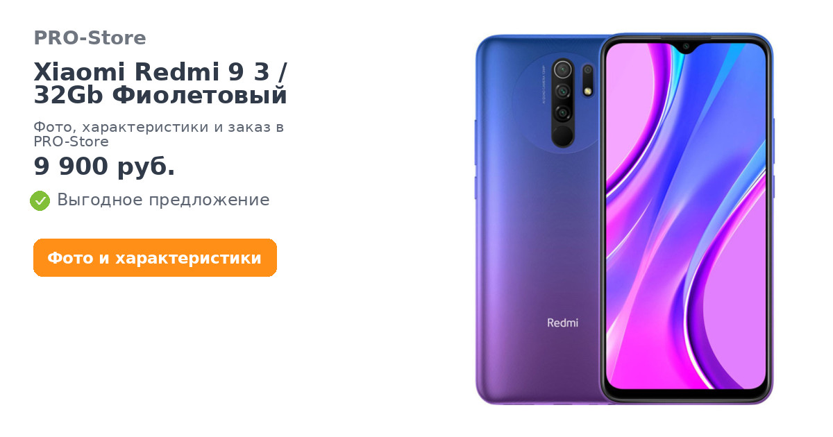 Смартфон Xiaomi Redmi 9 3/32Gb Фиолетовый (Purple) – очередная новинка Xiaomi в 2020 году. Телефон получил новый стильный дизайн, довольно легкий вес при диагонали экрана в 6.53 дюйма и топовые характеристики среди всех бюджетников. Купить Смартфон Xiaomi Redmi 9 3/32Gb Фиолетовый (Purple) станет лучшим решением для современных пользователей. Телефон обладает отличной четырехмодульной камерой, мощным и современным процессором и высокой автономностью. Остановимся подробнее на всех характеристиках смартфона Сяоми Редми 9.