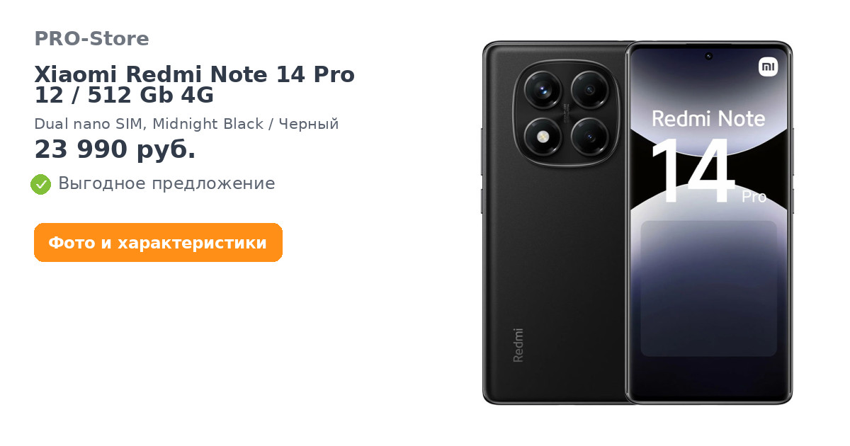 Смартфон Xiaomi Redmi Note 14 Pro 12/512 Gb 4G, Dual nano SIM, Midnight Black/Черный