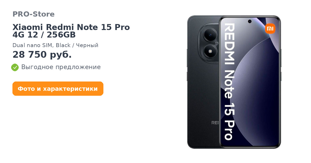 Смартфон Xiaomi Redmi Note 15 Pro 4G 12/256GB, Dual nano SIM, Black/Черный
