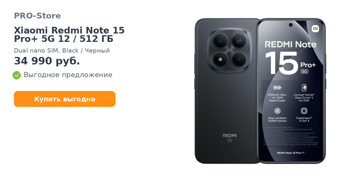 Смартфон Xiaomi Redmi Note 15 Pro+ 5G 12/512 ГБ, Dual nano SIM, Black/Черный
